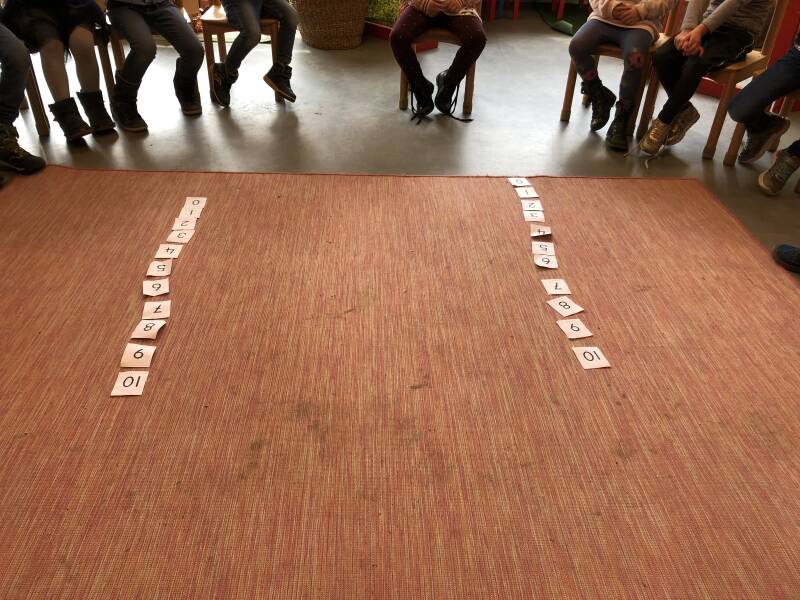 In de middagkring mocht ik mijn lesje geven. Ik had een rekenlesje voorbereid over een boer die over een hobbel reed en dat ze alle cijfertjes van de versnellingen op zijn tractor, kapot gingen. Of wij misschien de cijfertjes 0 tot 10 op de goede volgorde konden leggen. Eerst oefende ik de getallen met ze door in sprongen van twee te tellen. Dit oefende ik met ze doordat ze de één hardop moesten zeggen en dan de twee moesten fluisteren, de drie hardop en de vier fluisterend, etc. Dit ging redelijk dus ging ik met ze door tot 20. Hierna gaf ik ze allemaal een kaartje met een getal, 0 tot 10. Deze moesten ze in de goede volgorde leggen. Achteraf gezien had ik hier beter in moeten differentiëren. Heel vonden het namelijk óf te makkelijk óf te moeilijk. Hierover heb ik volop gepraat met mijn mentor en we hebben allemaal manieren bedacht hoe ik dit kon doen.